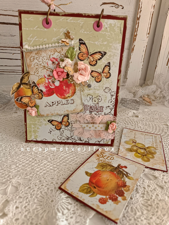 Chevalet pupitre se replie à plat pour un rangement facile et se pose debout pour consulter ses recettes de confitures. Vous pouvez ajouter des recettes avec ses pages intérieures à petits carreaux ou ses jolies pages en couleur. Il est agrémenté de jolies étiquettes sur le thème des fruits (peut servir pour des recettes de desserts). Avec ses anneaux en reliure, vous pouvez facilement les ouvrir et ajouter ou sortir des pages si besoin. Papiers de la marque Prima Marketing. Taille ouvert environ : 21x15x13 cm. Modèle unique, 1 seul en stock.