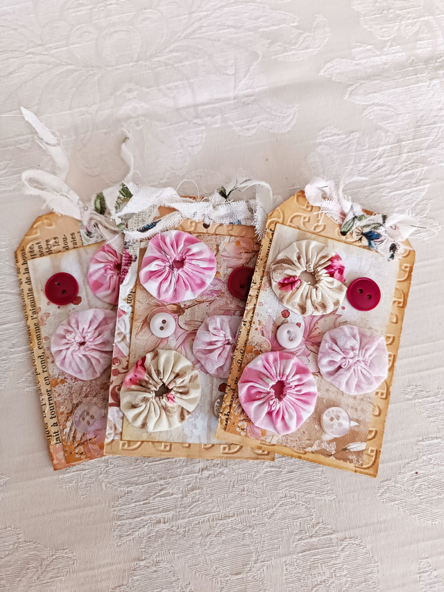 un lot de 3 mini yoyos réalisés par mes soins, taille de chaque yoyo environ 3 cm de diamètre + 3 boutons dans les mêmes tons.